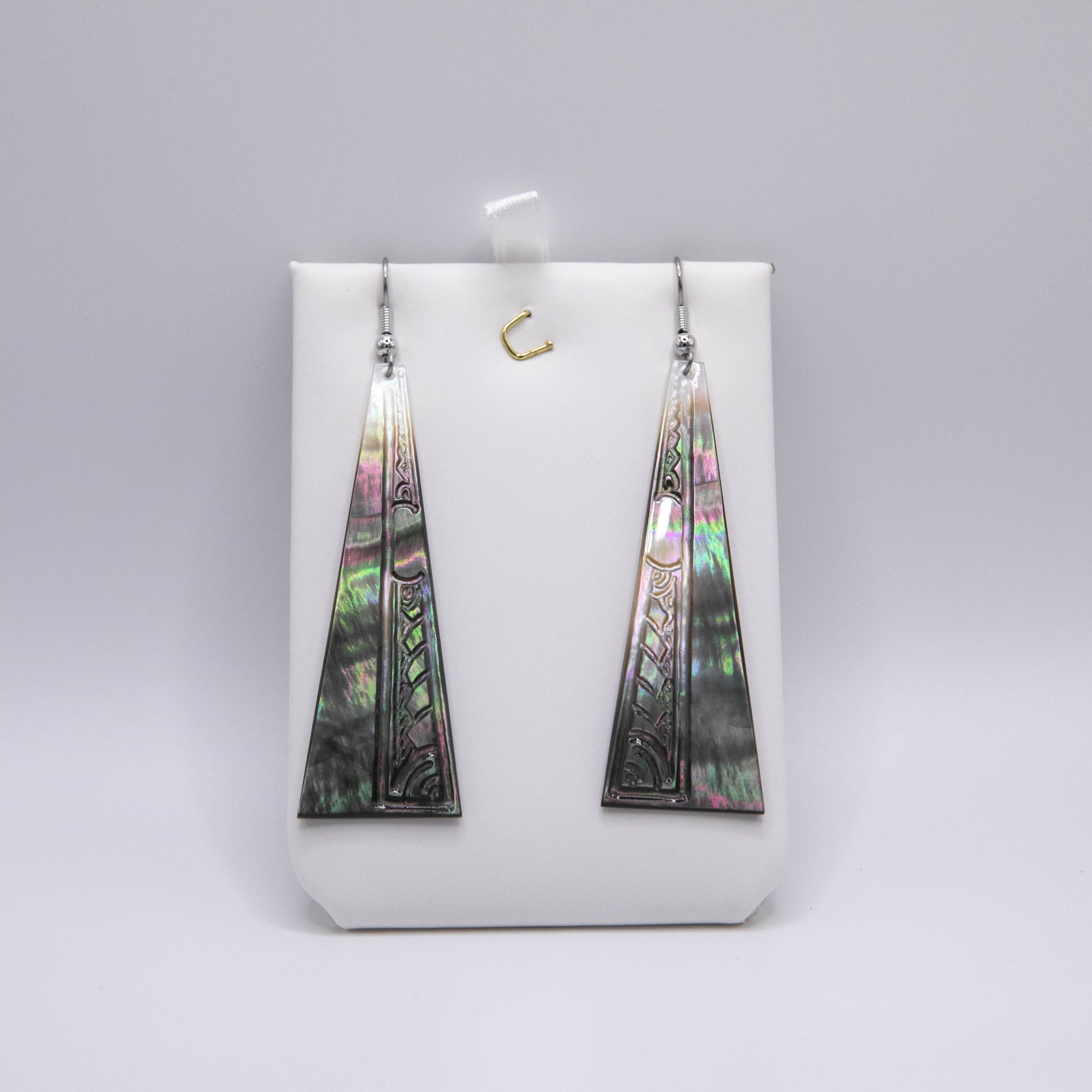 Hand made in Tahiti carved triangle shaped Tahitian mother of pearl shell earrings. Mounted on silver hooks and measures approximately 2.5 inches in length .
