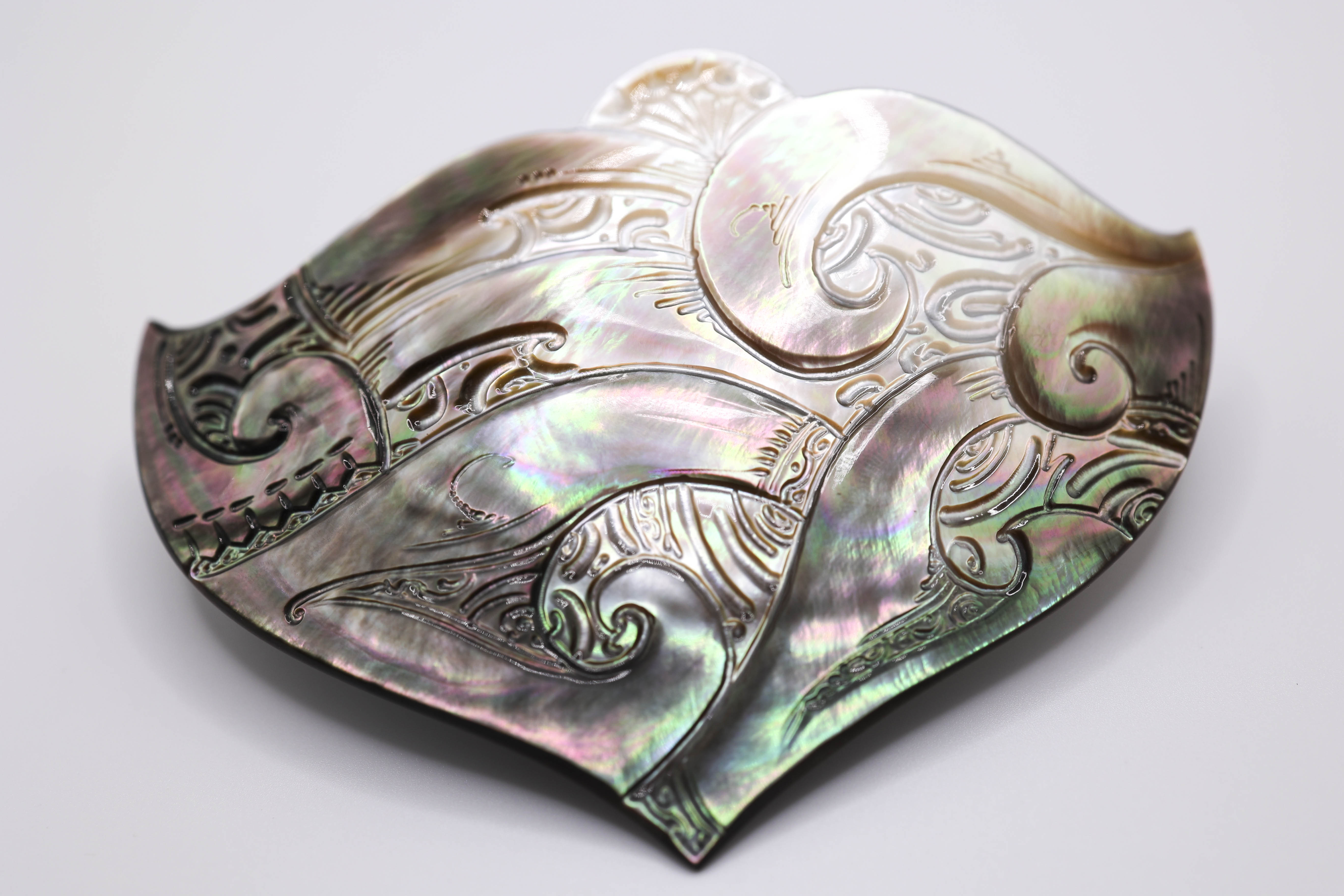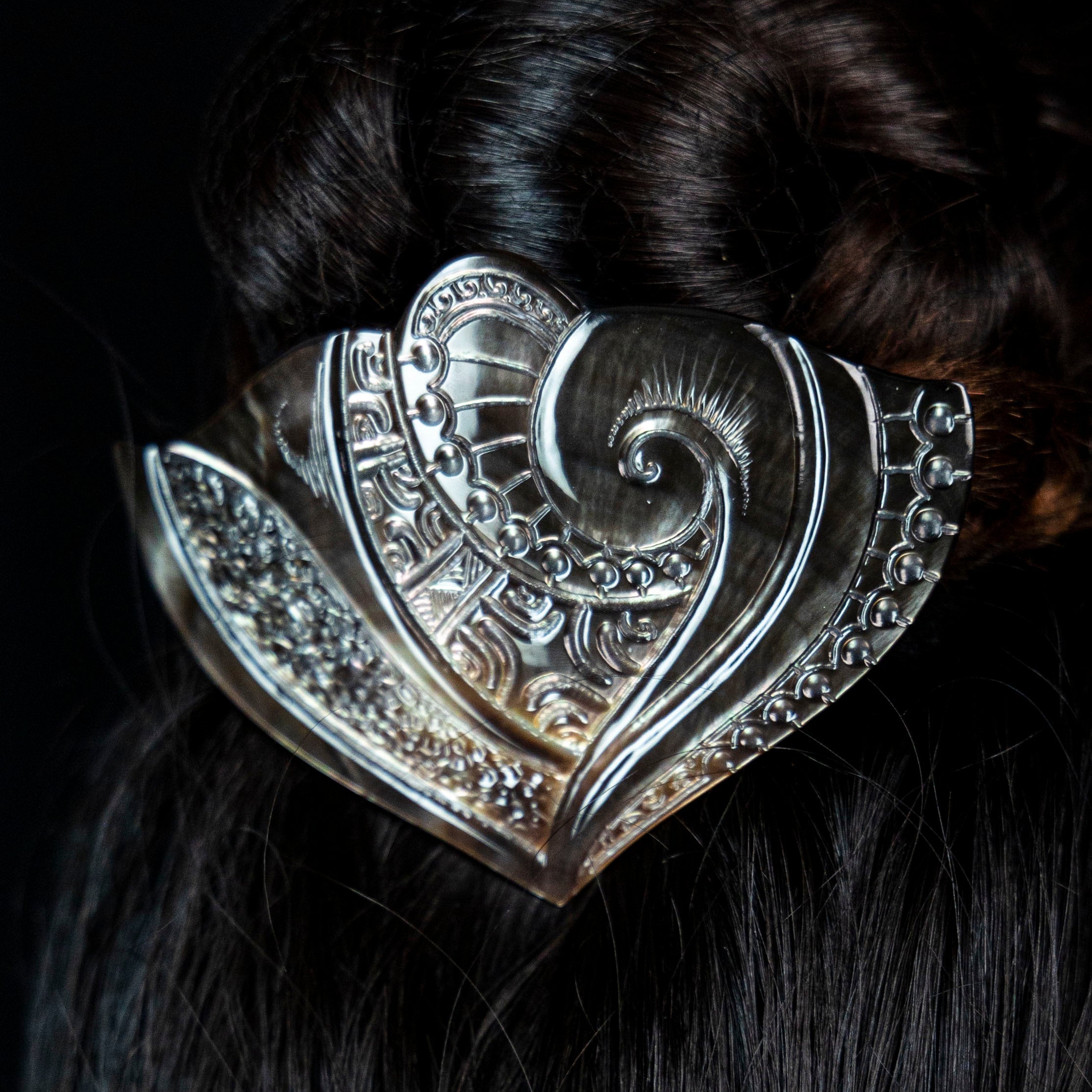 Hand made in Tahiti elegantly carved and custom shaped Tahitian mother of pearl shell hair clip and mounted on a 3.5 inch hair clip