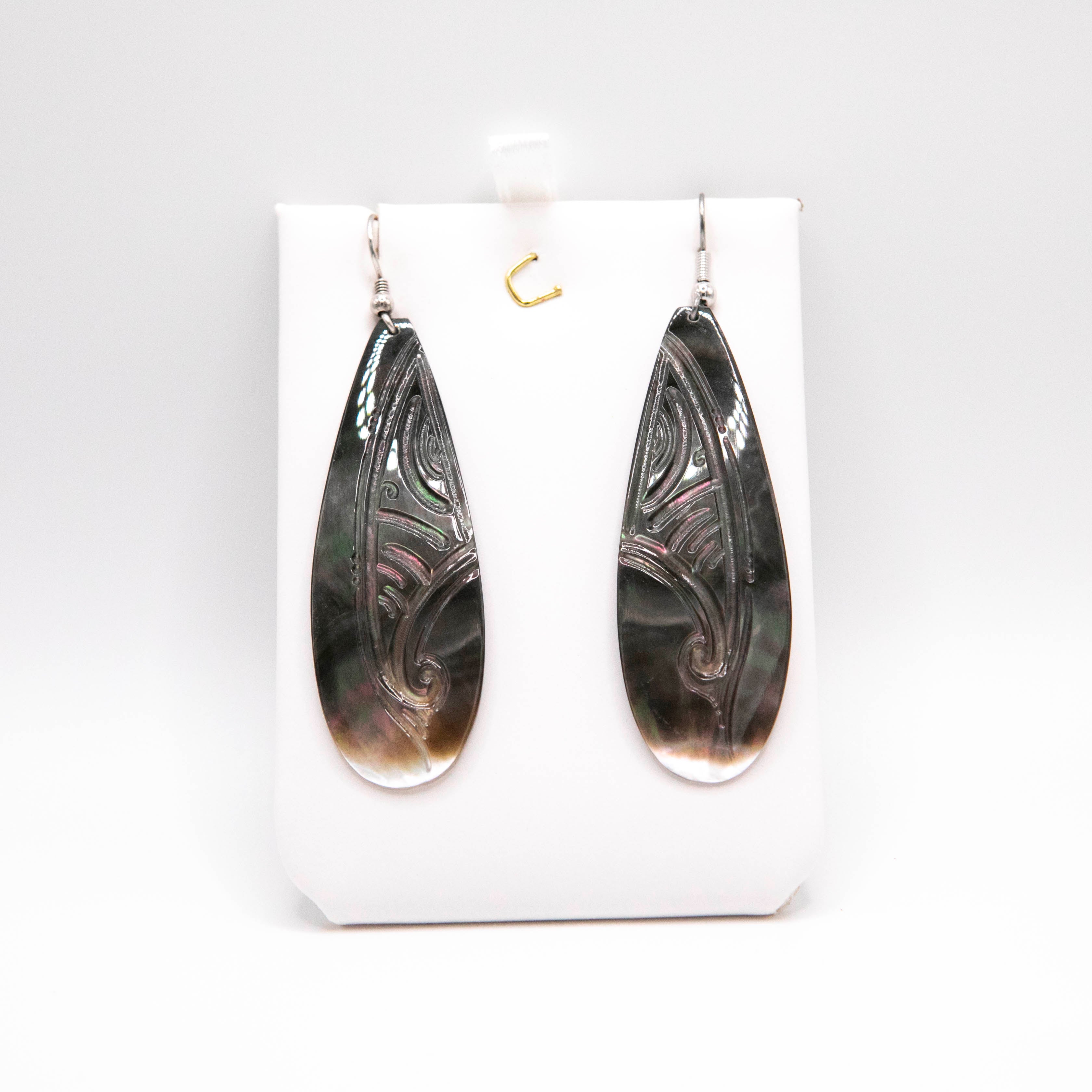 Hand made in Tahiti. Oval Tahitian mother of pearl rectangle shaped mini shell earrings. Mounted on silver hooks and measures approximately 2.5 inches in length .