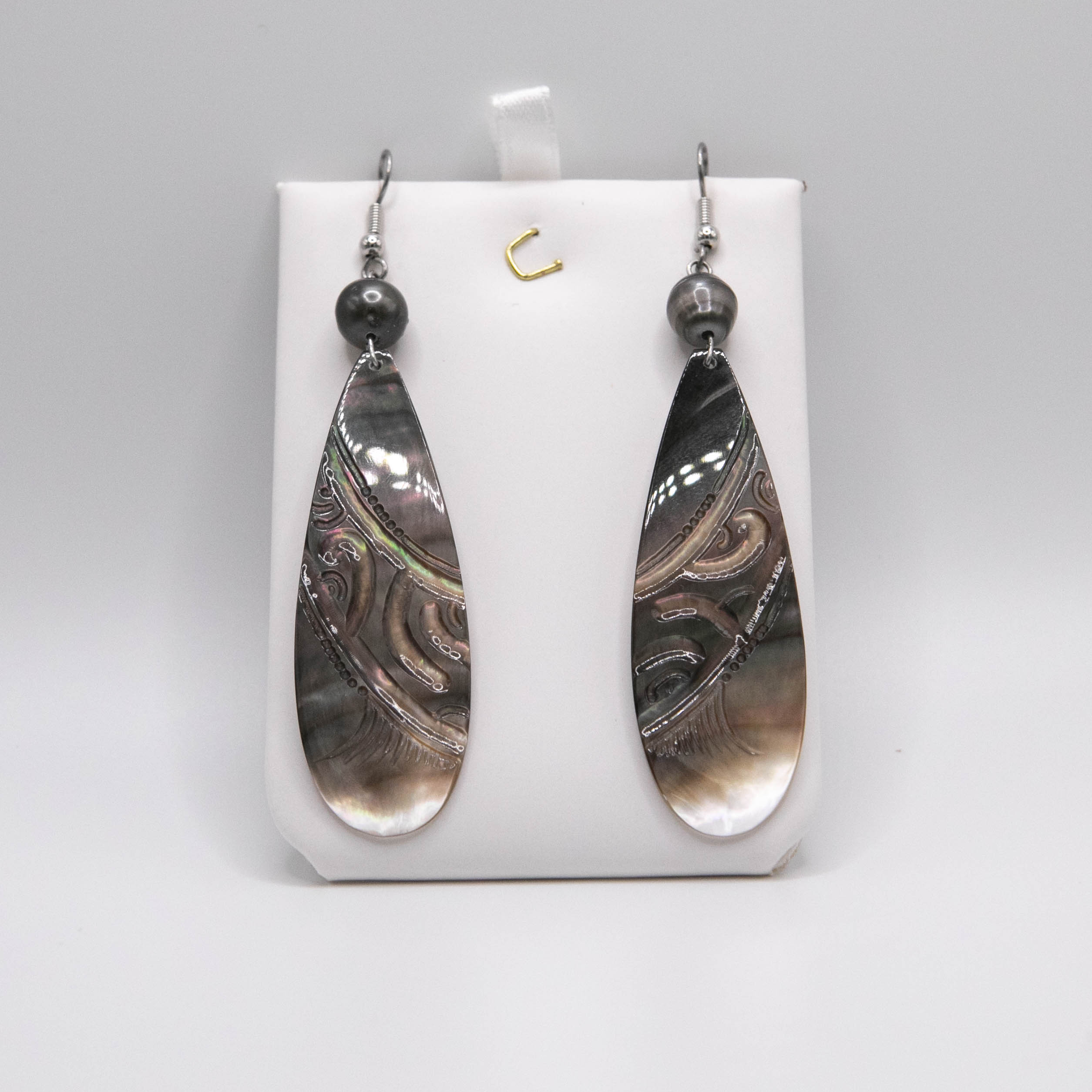 Hand carved Tahitian mother of Pearl shell earrings topped with Grade A Tahitian pearls. Measures approximately 2.5 inches in length. Mounted on silver plaited hooks.
