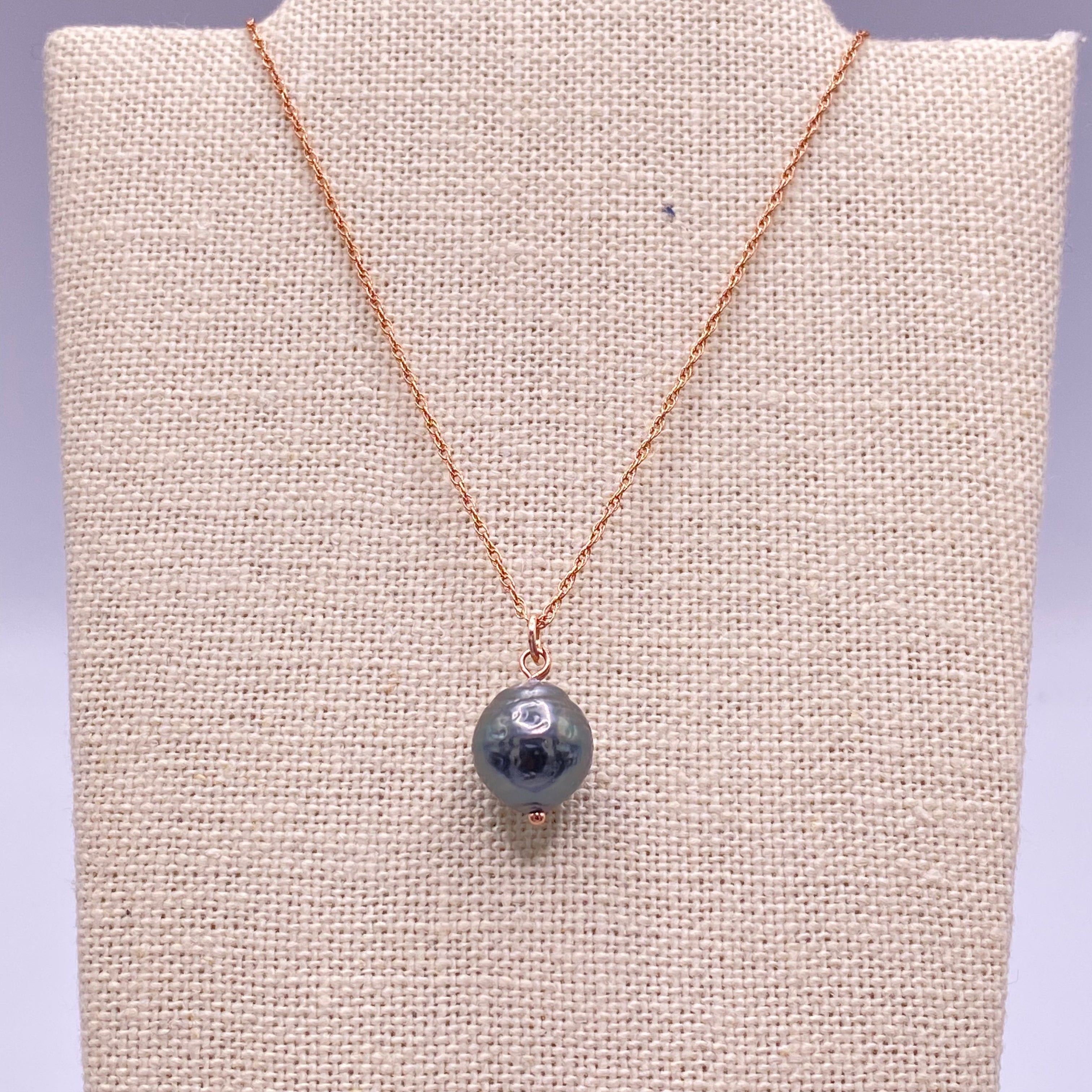 Natural imperfect Tahitian Black Pearl on a 18" rose gold spiral chain