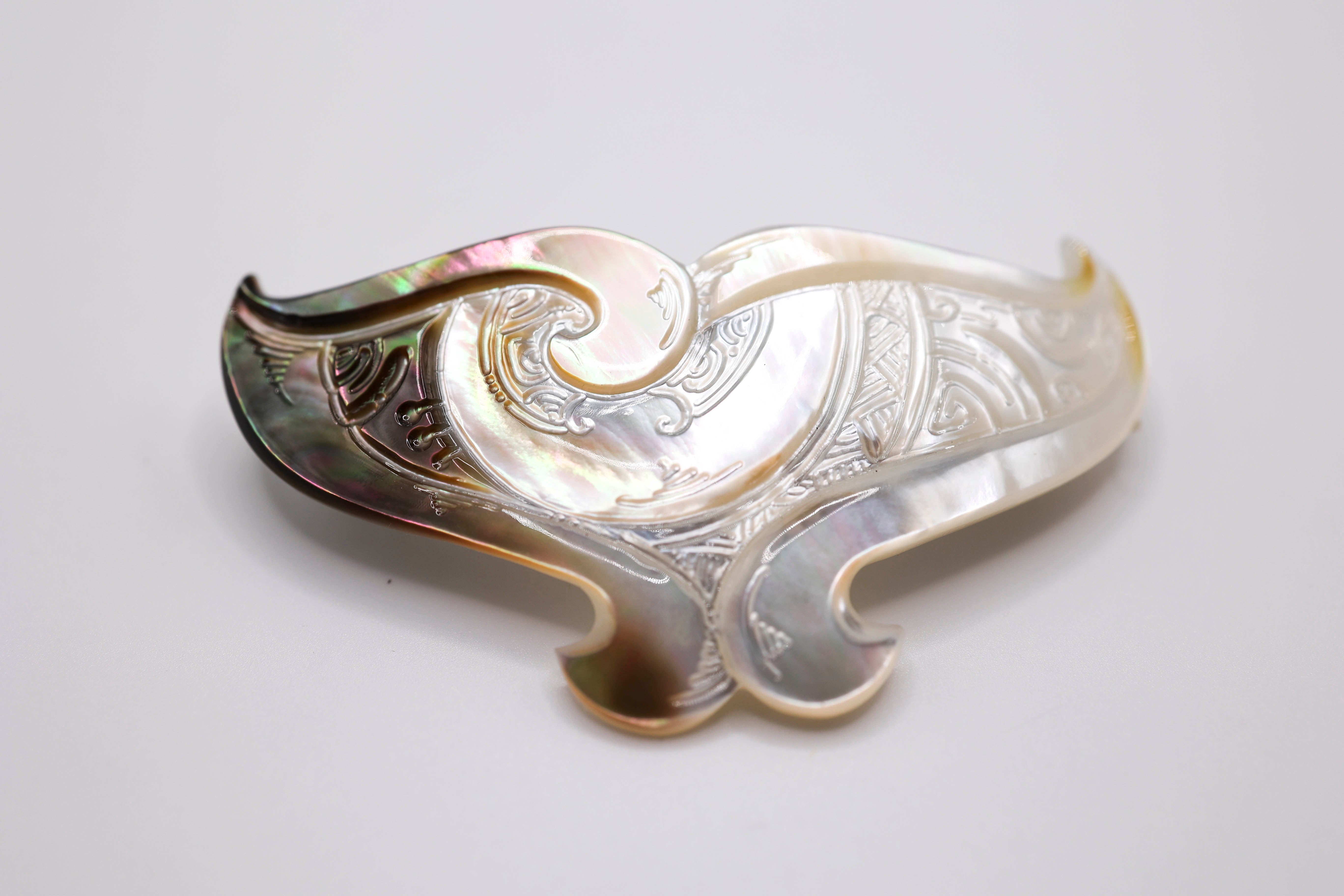 Hand made in Tahiti elegantly carved and custom shaped Tahitian mother of pearl shell hair clasp and mounted on a 2.5 inch hair clip