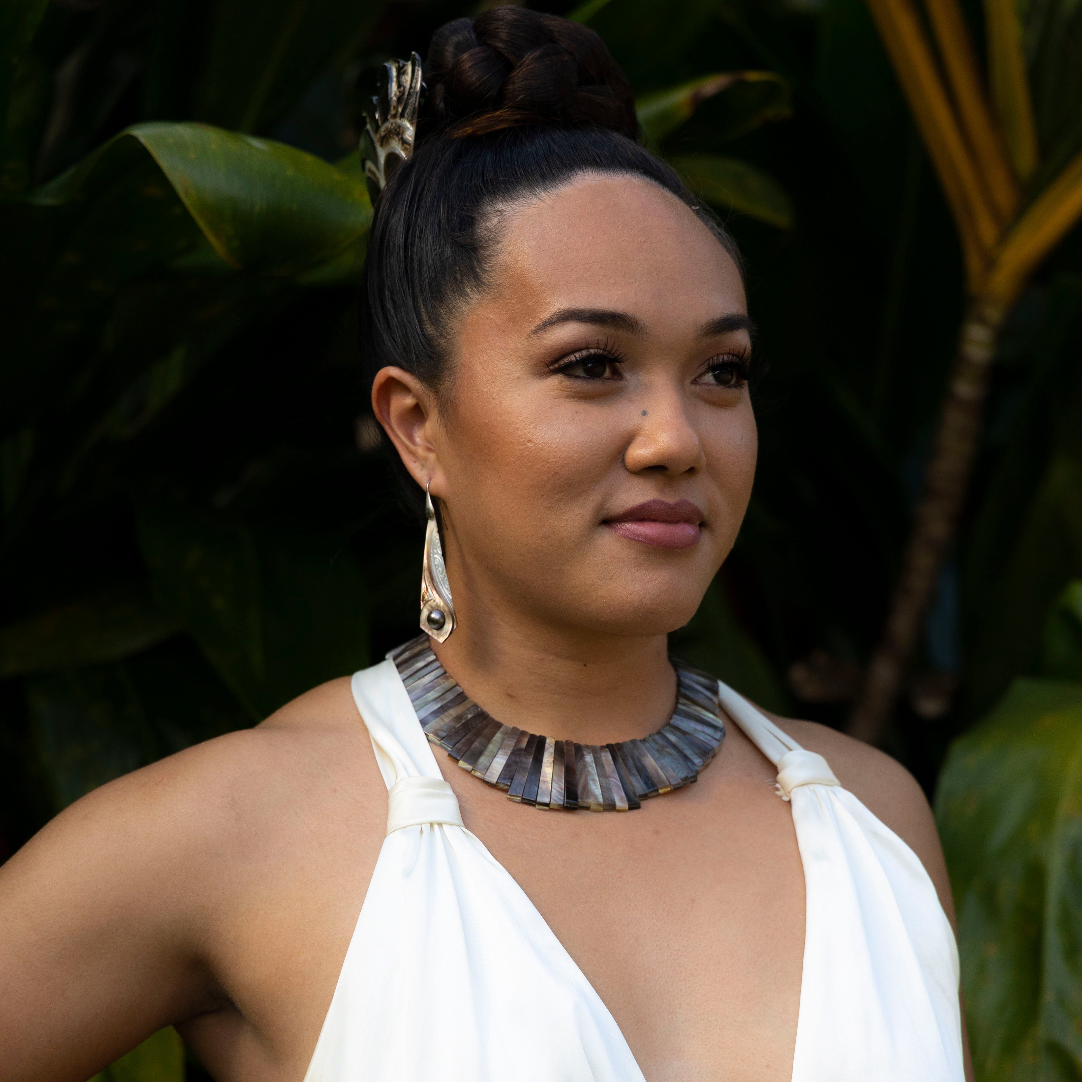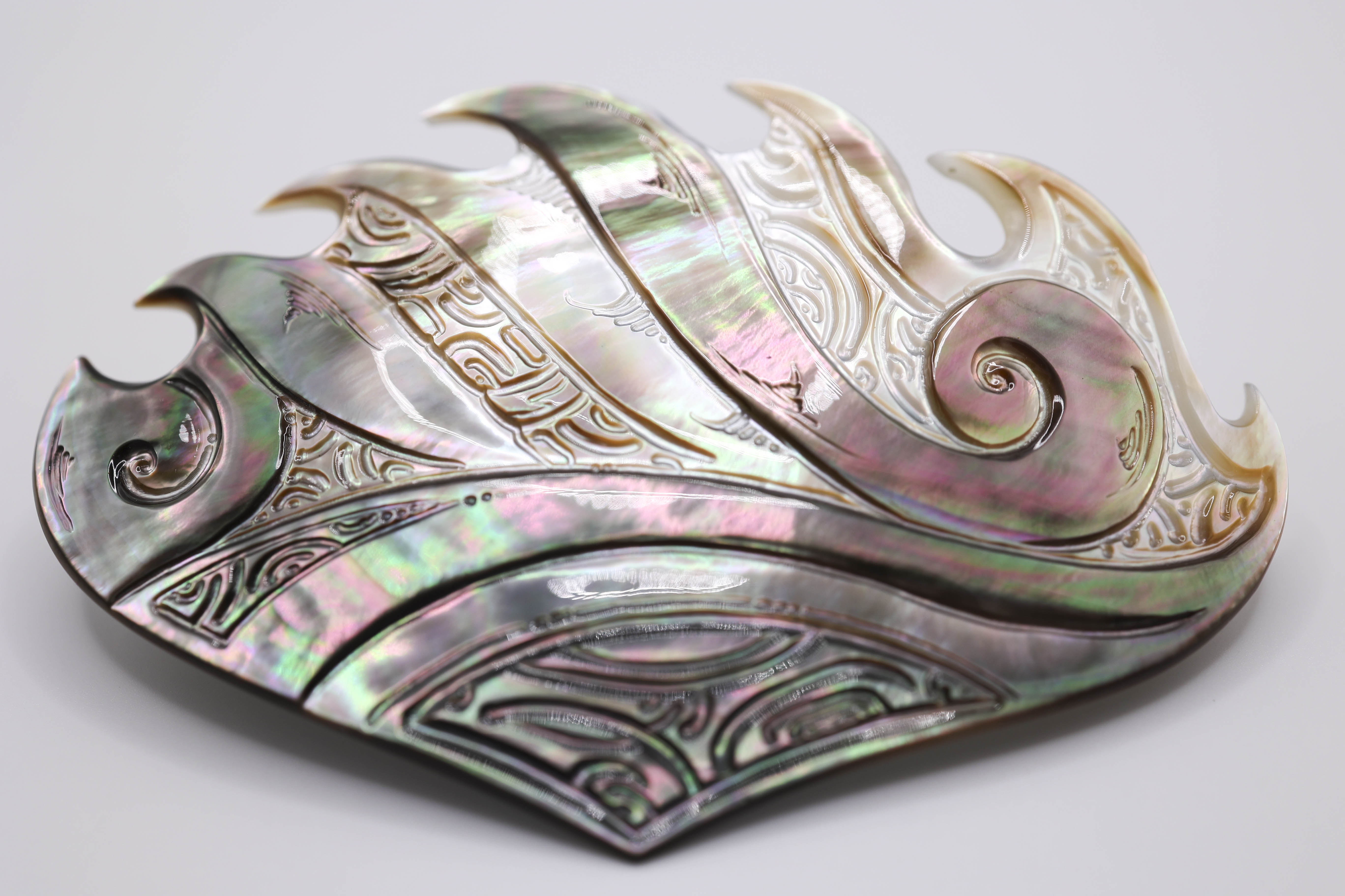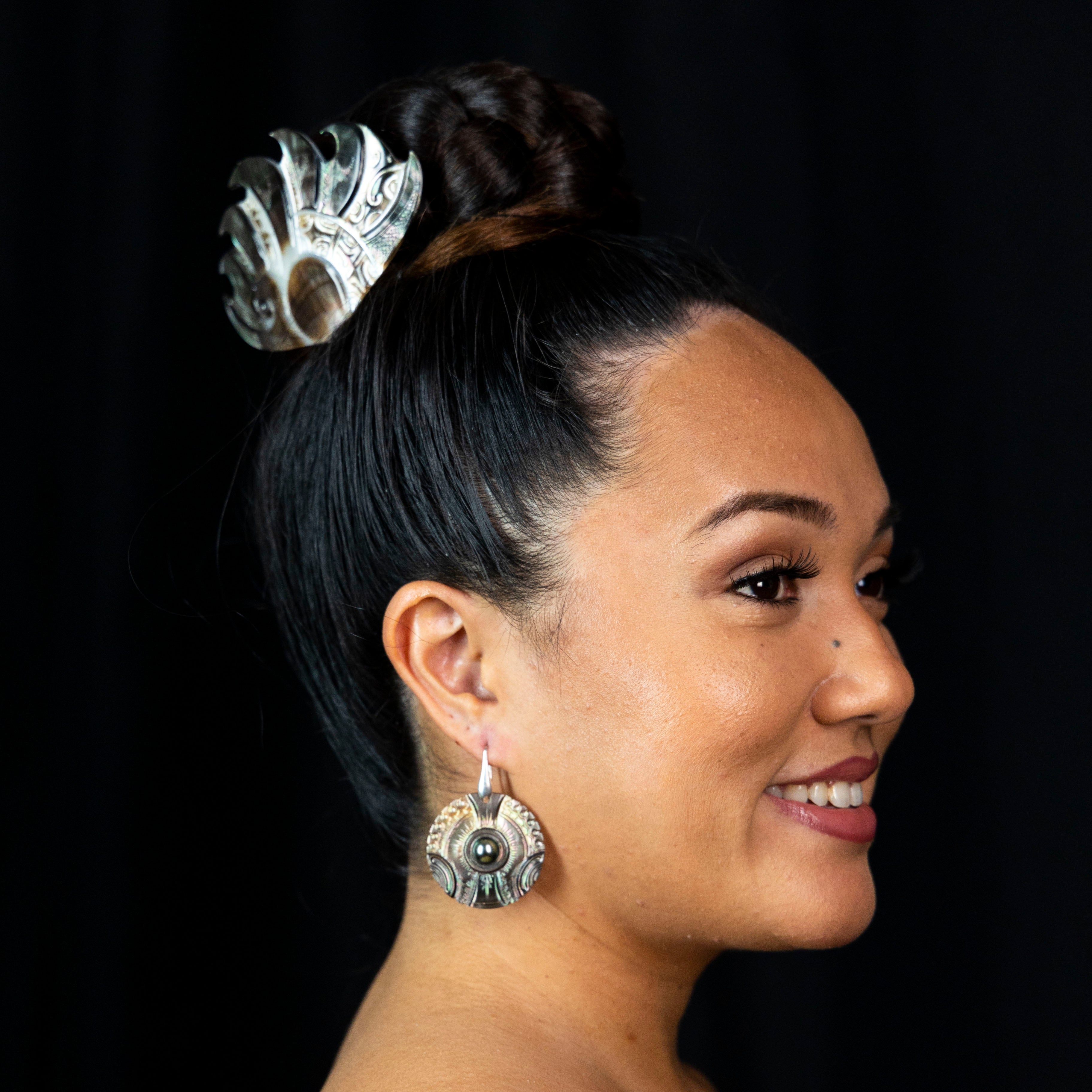 Hand made in Tahiti elegantly carved and custom shaped Tahitian mother of pearl shell hair clip and mounted on a 3.5 inch hair clip