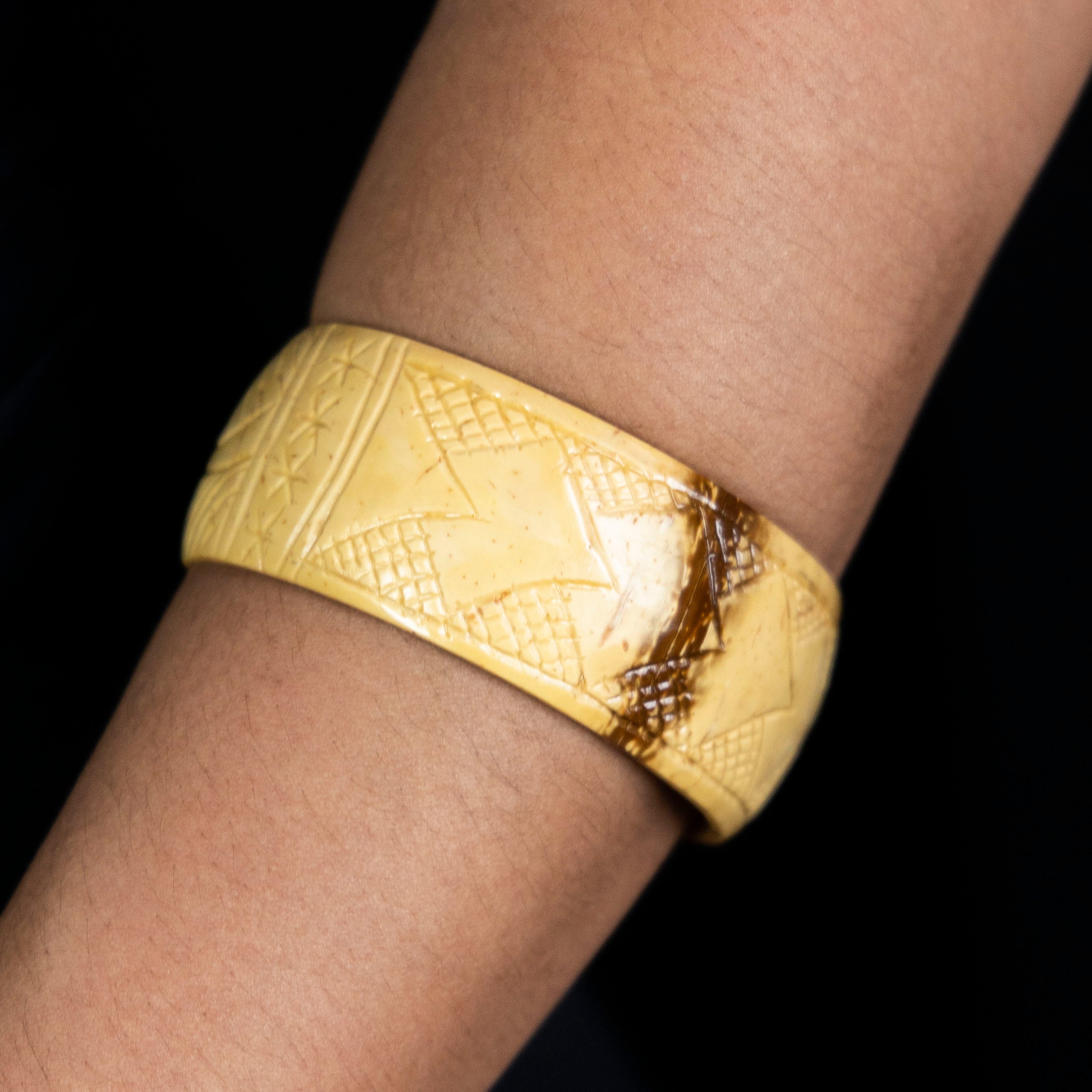 Hand crafted made in Sāmoa. Light colored Niu (coconut) armband perfect to wear as an accessory or with cultural attire. Armband is adjustable and measures a little over 3 inches in diameter and 1.5 inches in width.