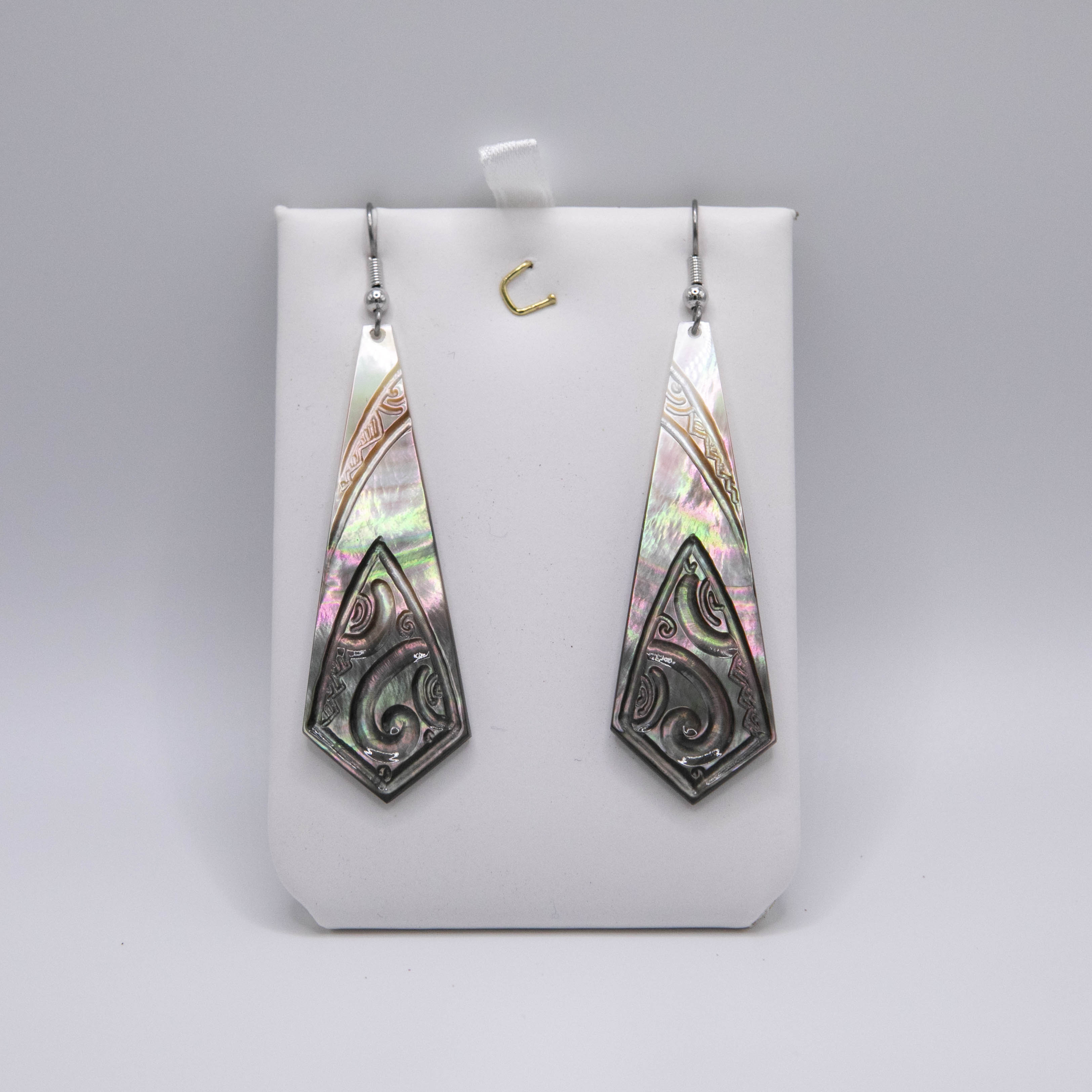 Hand made in Tahiti Tahitian mother of pearl drop shell earrings. Mounted on silver hooks and measures approximately 2.5 inches in length .