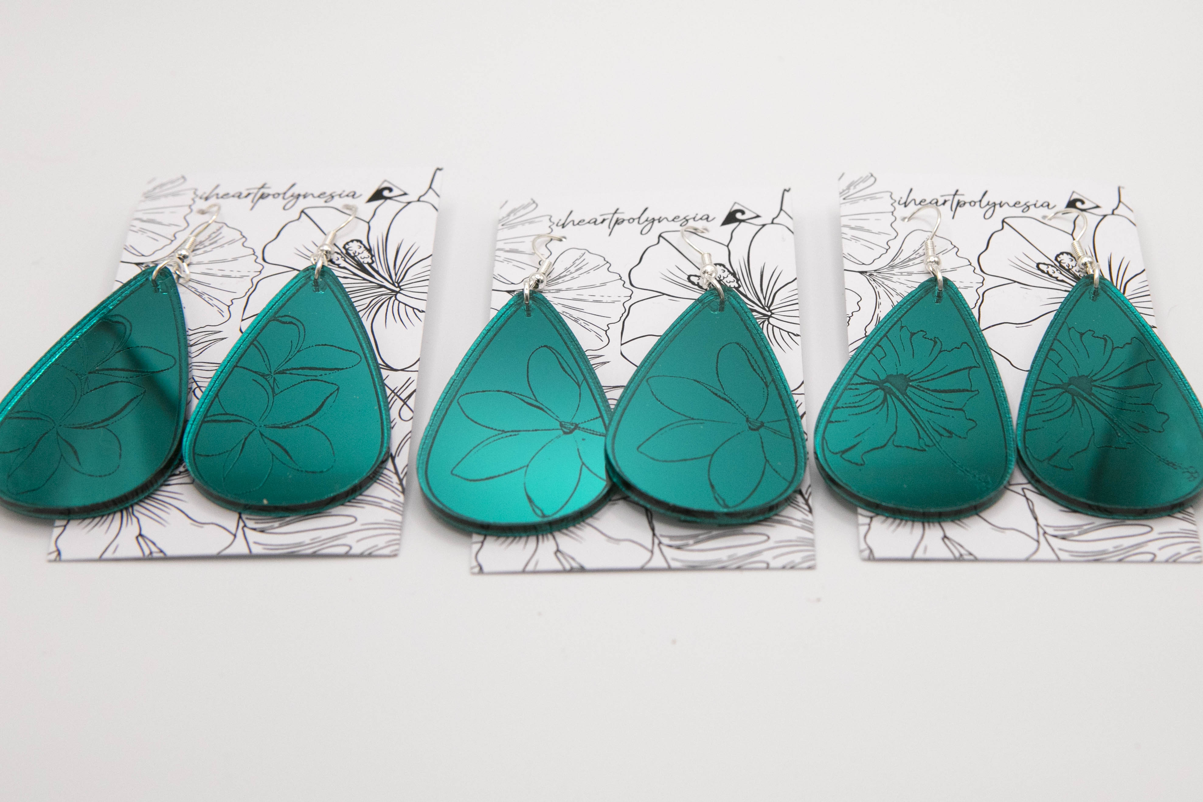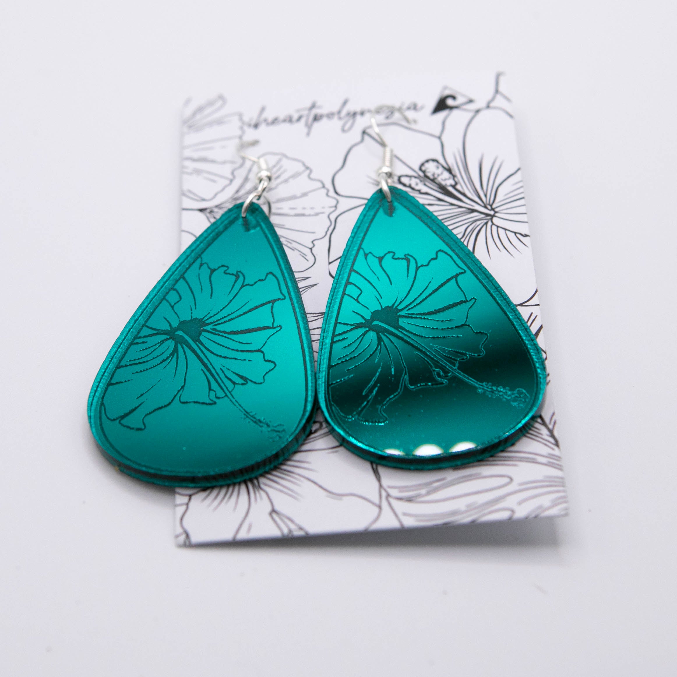 Tear Drop Hibiscus earrings Laser engraved and assembled in Hawai'i on acrylic. measuring 2" in length